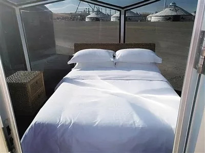 除了富有蒙古族特色的蒙古包外,還有74輛房車、130棟星光房?!胺寇嚪譃?6平方米的一室一廳和二室一廳、105平方米的閣樓三種類型,第一種能容納5—8人,第二種能容納8—9人,第三種能容納10—11人,價格分別是2580元、2980元、3580元。星光房每間占地9平方米,十一期間的價格是598元。”陶格斯說。
