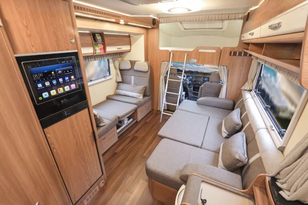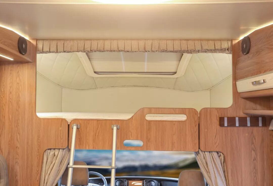 金冠格林卡諾329C整體布局為5床6座:大家庭或朋友團一起出游毫無壓力;將電視板翻下,額頭處形成一橫置雙人床鋪,1200×2100mm的尺寸可供兩位成年人使用;床鋪空高650mm,加上頂部曲面大天窗,睡在床上通透寬敞,活動自如,徹底解決額頭床空間局促的疑難問題;床位旁設置有多功能折疊式壁掛鉤,方便懸掛衣物或小物件。