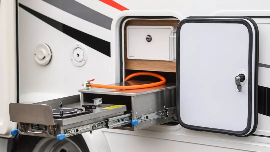 金冠格林卡諾329C型房車設計有外置廚房和內(nèi)置廚房,其中外置廚房配備了:抽拉式外置燃氣灶、伸縮式冷熱水籠頭、220V五孔插座以及獨立帶閥門氣源倉,讓您在房車旅途中輕松享受戶外烹飪的樂趣。