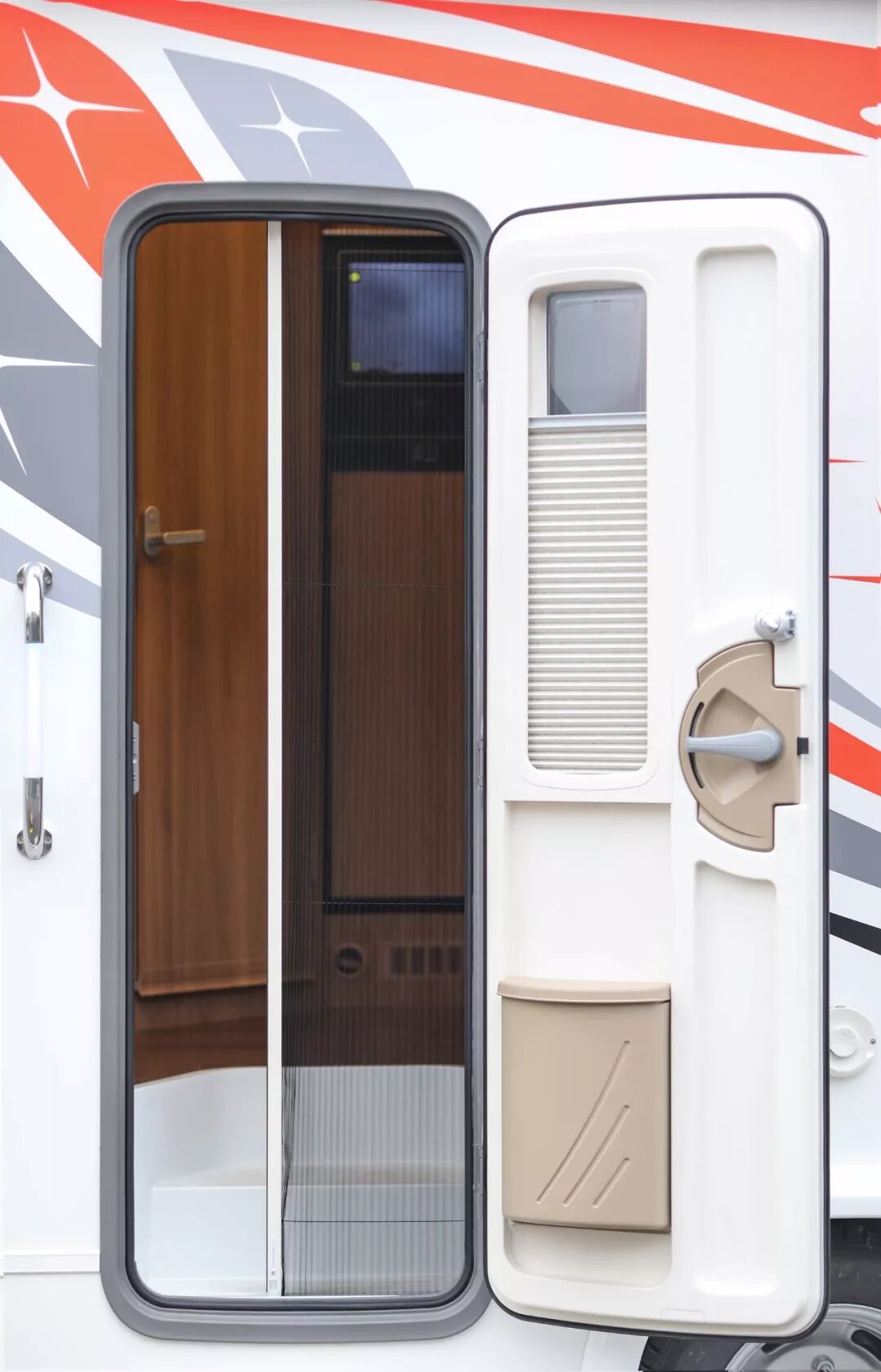 車尾入戶門選用多美達房車專用車門,內(nèi)置伸縮防蚊簾,配備進口Fiamma兒童鎖,出行安全更有保障。